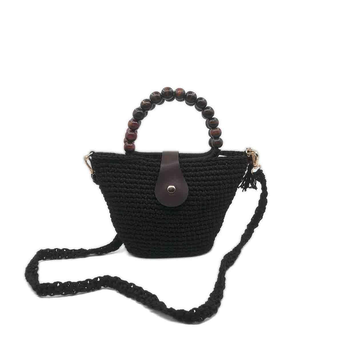 Kaliteli tekstil örgü ipinden sıkı bir dokumayla hazırlanan çantanın en belirgin özelliği, el işçiliğiyle üretilmiş cilalı ahşap boncuklardan oluşan zarif sapıdır. Bu özel detay, çantaya hem otantik hem de lüks bir hava katar. İçine telefon, cüzdan ve anahtar gibi temel eşyalarınızı rahatça sığdırabileceğiniz ideal boyuttadır.